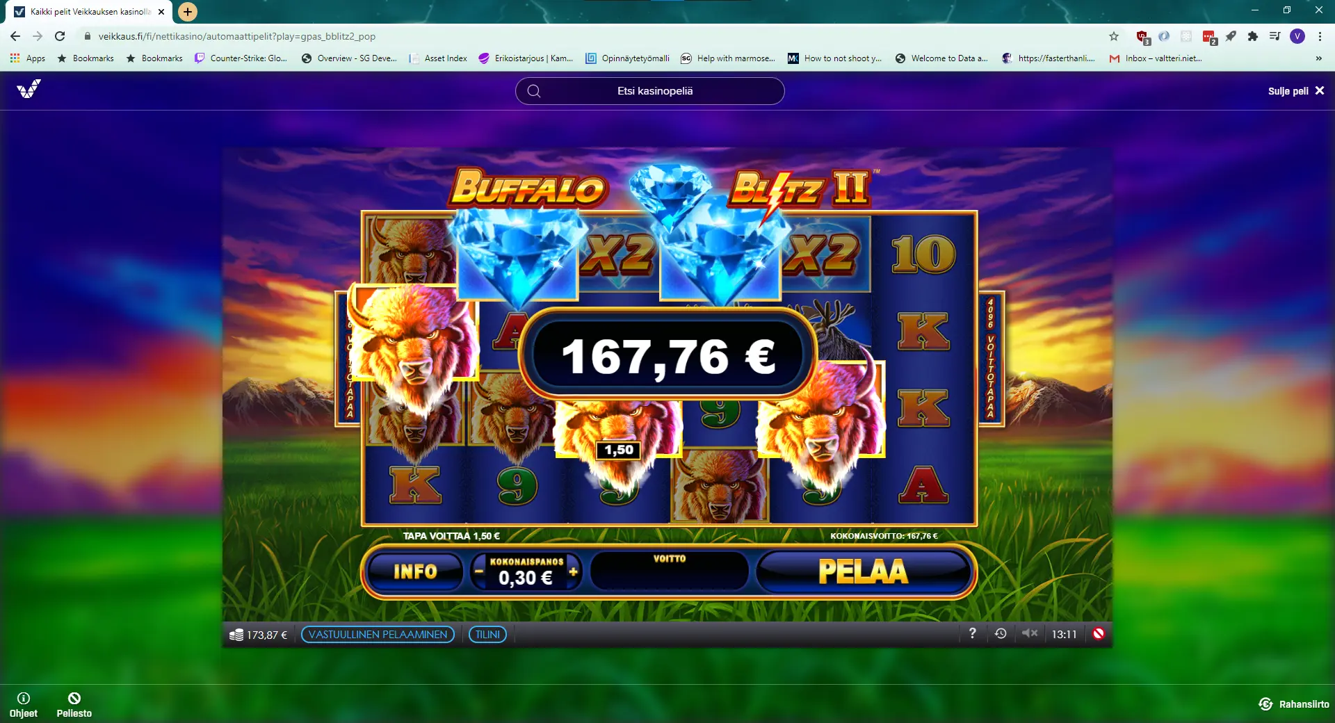 Päätin muutaman hävityn betsin jälkeen kokeilla slotteja veikkauksella ja osui tollanen buffalo blitzistä