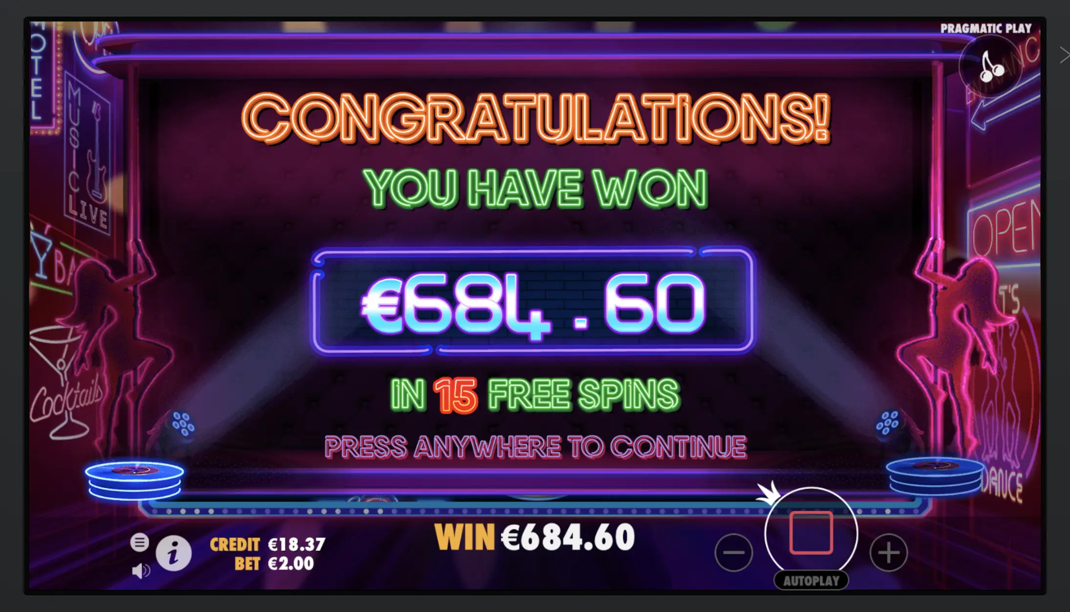 Ilmaiskiepeillä sain 11€. Tanssibileet iski heti scatterit ja 10 kertoimella aakkosta hyvin läpi asti josta 300x osuma.