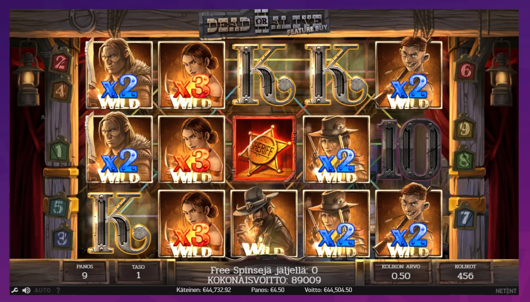 Loppupöytä näyttää härskimmältä mitä voitto. Wildline tuli 3. viimisellä spinnillä, mutta sitten seuraavalla puotti 3 wildia ja pöydän tämän näköiseksi ja tällä pyöri sit viimiset kaks spinniä.