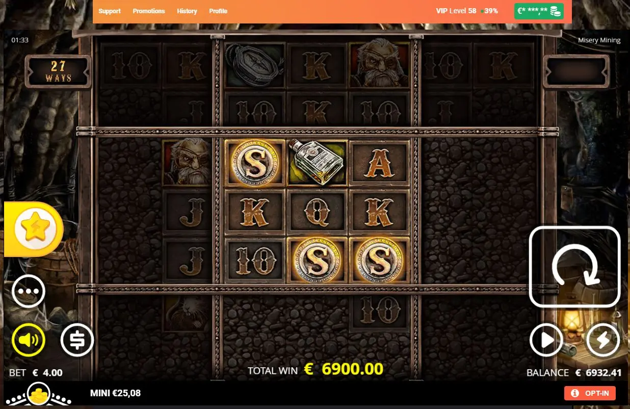 Nyt heitti 4e panoksella lähes samanlaisen mitä aiemmin 2e. Vasen reuna auki ja sieltä laatikot alas asti auki. En kunnolla tajunnut mitä tuossa tapahtuu, mutta ilmeisesti kun olisi osunut lisäspinnejä rat modessa niin olisi rytissyt monta kertaa vielä enemmän.