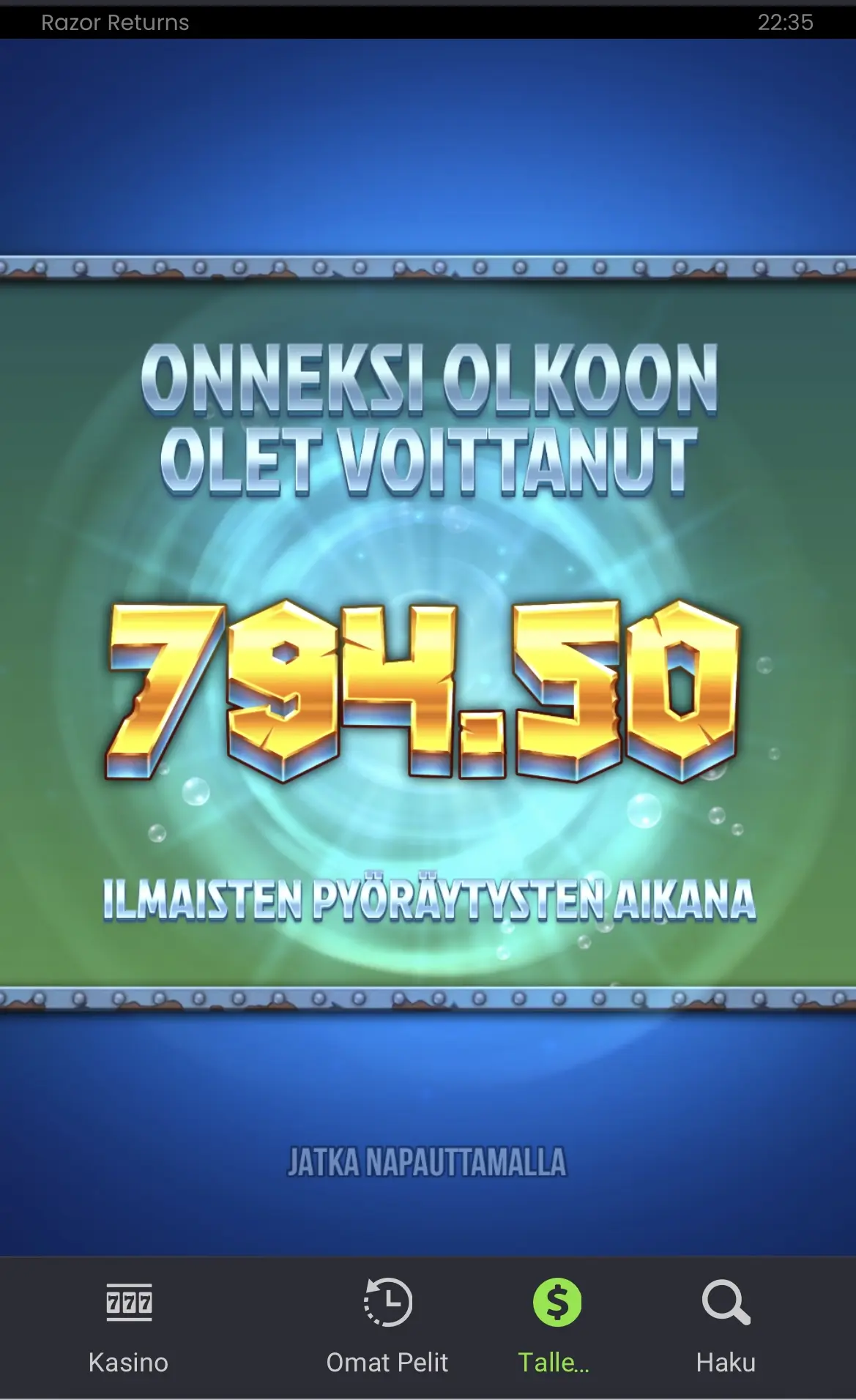 Siinä toinen bonusosuma uudesta Razor Returnista. Se taisikin olla tämä bonus, jossa kerroin nousi sinne n. 40x, levää tiputteli mukavasti, mutta kolikot oli joku muu jo kerenny käydä keräämässä.