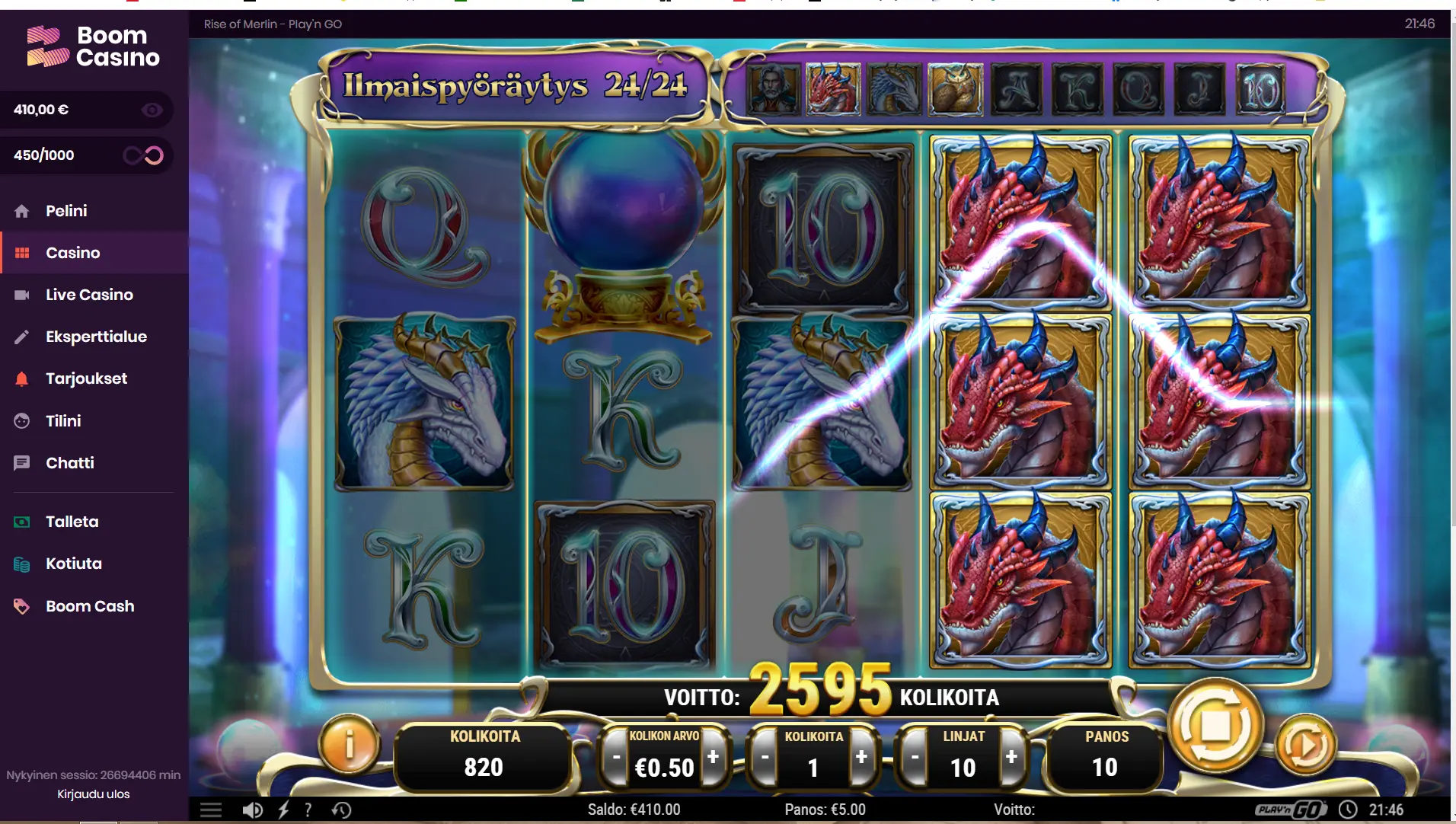 Merlinissä 2kertaa iski reriggerit. 10 tuli täysruutu kerran. Premiumit oli kyl kuraa. 3 dragonia oli paras. Taas jäi ihan luukulle isompi lötkönen.