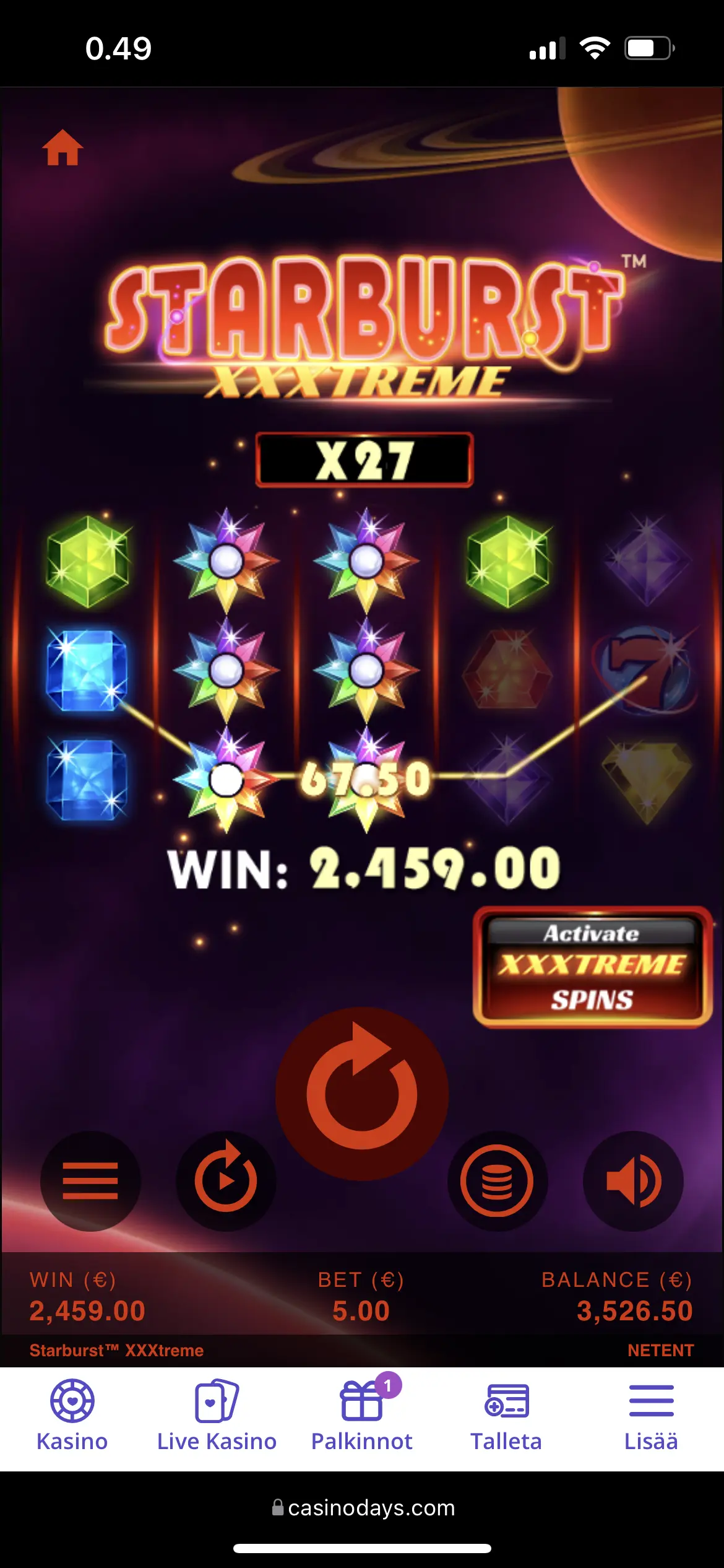 Kivasti napsu tuplatähdillä vaikka ainoastaan oranssit meni kerran läpi asti ekalla spinnillä. 1500€+900€ osumat.. Nou-stikillä 3k nostoon